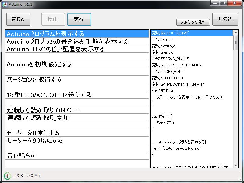 プログラムダウンロード ソースコード | ![]() ※付属のプログラム(Actuino.ino)をArduinoに書き込む必要があります。 |